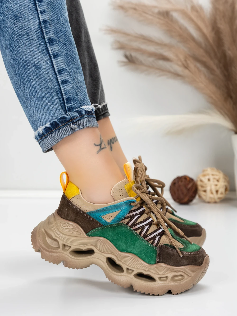 Damskie buty sportowe wykonane ze skóry naturalnej HY6383 Zielony-Żółty | Franco Gerardo